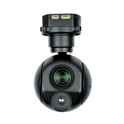 KHY10G207A is a 90X mixed zoom camera gimbal integrated with a 7mm lens 256×192 vanadium oxide infrared thermal imager and high-precision three-axis stability, supporting IP and HDMI output, for providing high stability, tiny figure, light weight and low power consumption. The EO camera uses a wide dynamic sensor with 2 mega effective pixels; S.BUS and IP control,back up with TF card storage. also supports various PIP modes, pseudo color patterns and global temperature measurement.